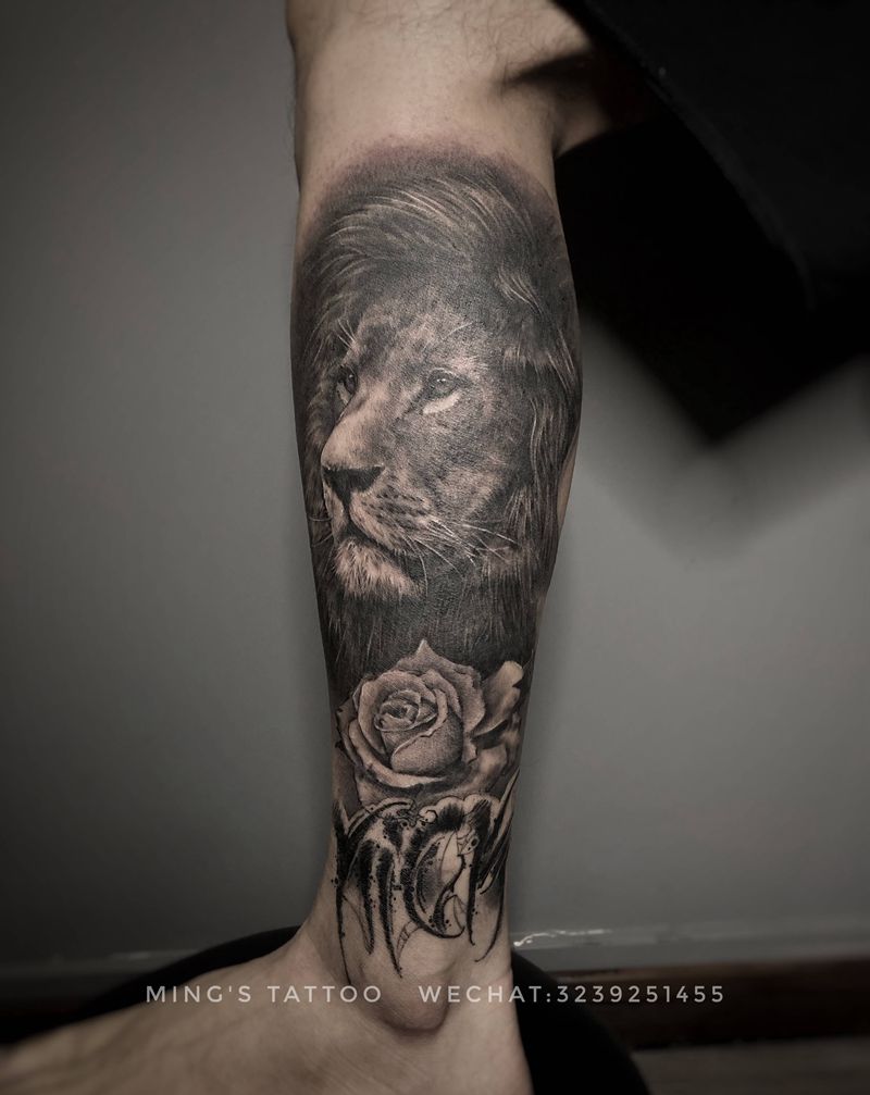 当前位置: 首页 >广东省广州市纹身店-框刺青纹身图案>小狮子纹身图片_腿部欧美写实狮子玫瑰纹身图案