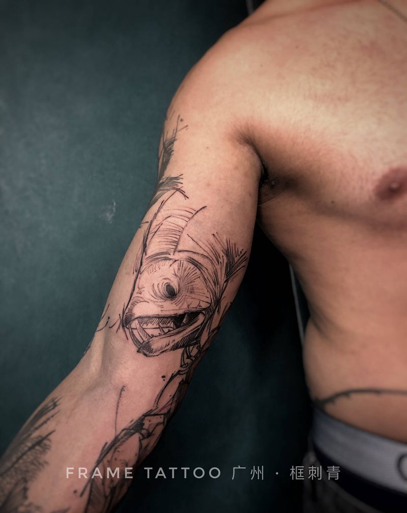 当前位置: 首页 >广东省广州市纹身店-框刺青纹身图案>鱼头草稿纹身图片_手臂水墨纹身图案
