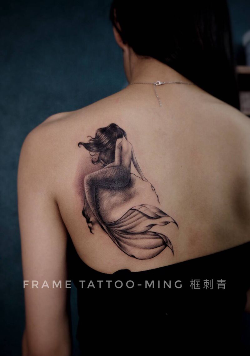 人鱼纹身图片_肩部欧美写实美人鱼纹身图案