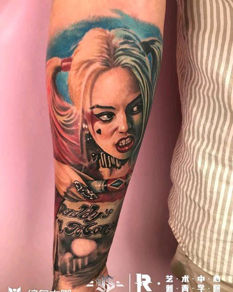 当前位置: 首页 >广东省广州市纹身店-广州RTattoo任刺青纹身图案>小丑女纹身图片_手臂欧美写实纹身图案