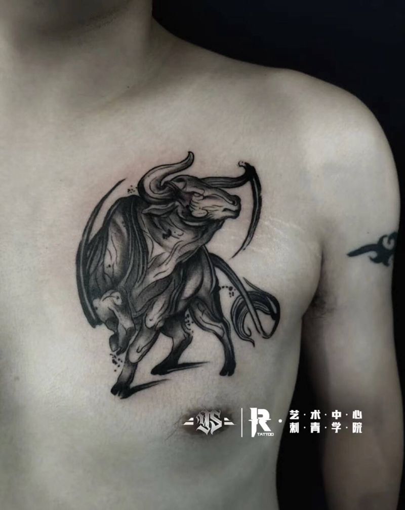 牛牛牛纹身图片_胸部欧美写实纹身图案