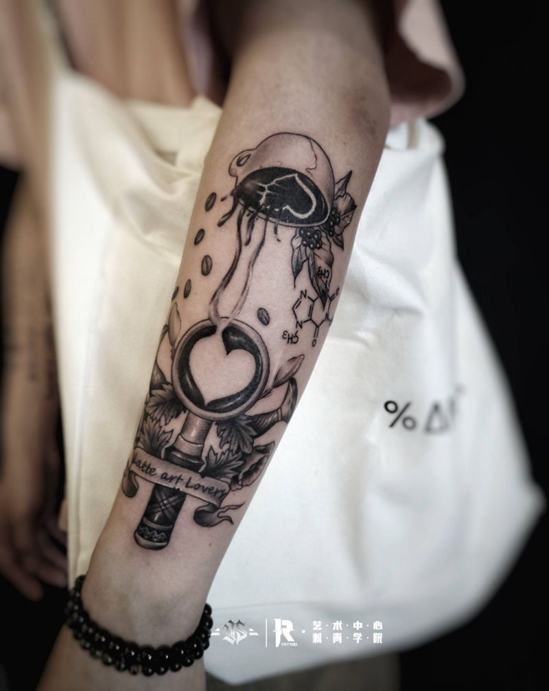 咖啡主题花臂纹身图片_手臂欧美写实纹身图案