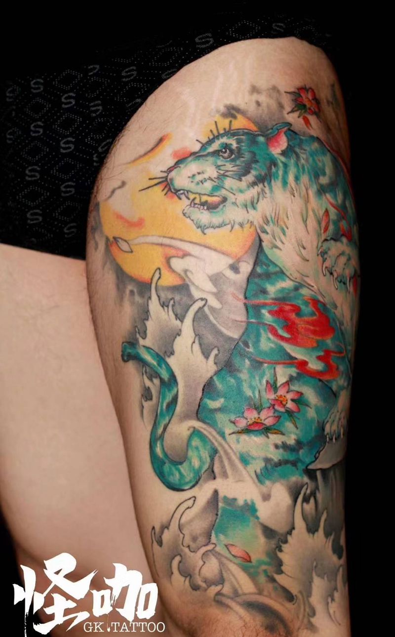 • T网红王老大花腿龙纹身图片_腿部新传统纹身图案