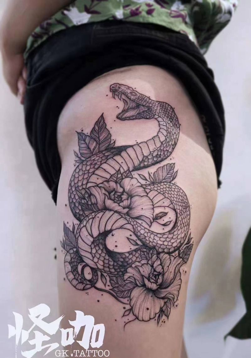 • T网红王老大花腿龙纹身图片_腿部新传统纹身图案