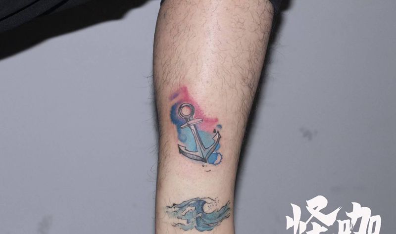 水彩系列纹身图片_胸部手臂水彩船锚帆船海浪纹身图案