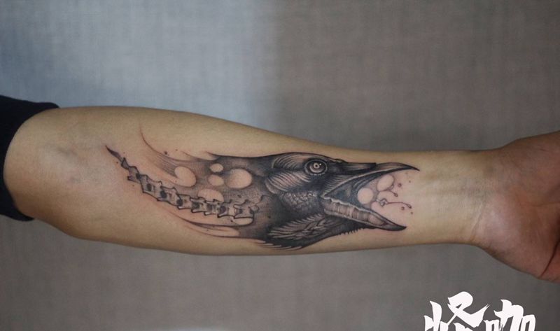 照片纹身图片_手臂鸟乌鸦写实纹身图案