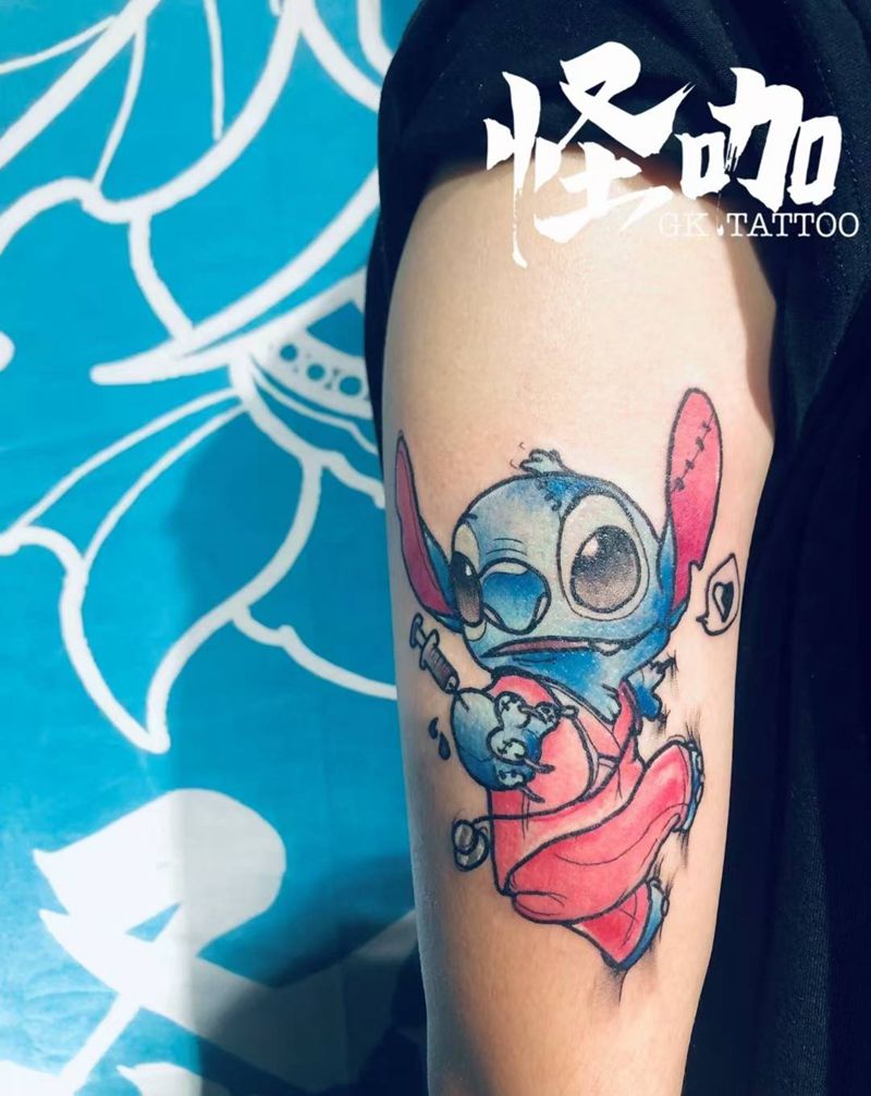当前位置: 首页 >广东省广州市纹身店-广州怪咖纹身刺青纹身图案>史迪仔纹身图片_手部手臂New School水彩纹身图案