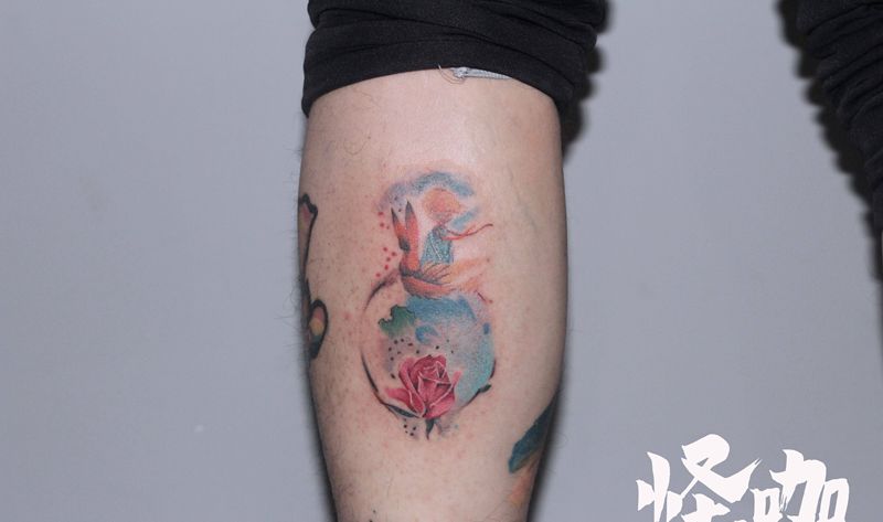 小王子纹身图片_腿部水彩玫瑰纹身图案