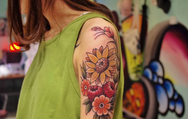 浆果小花大杂烩纹身图片_肩部手臂Old School水彩花臂清新向日葵纹身图案