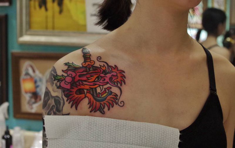 • T网红王老大花腿龙纹身图片_腿部新传统纹身图案