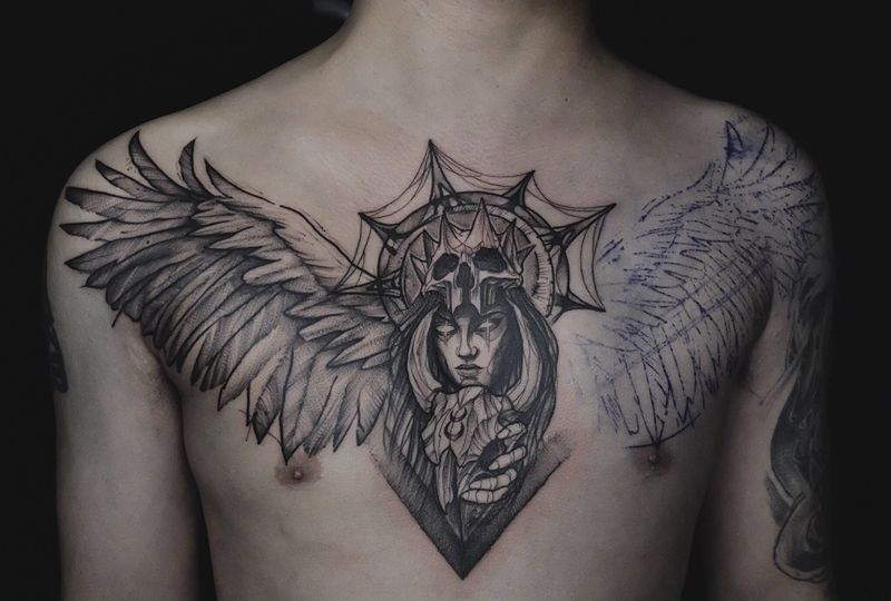 广州纹身 | 男生花胸纹身图片_胸部New School翅膀暗黑纹身图案