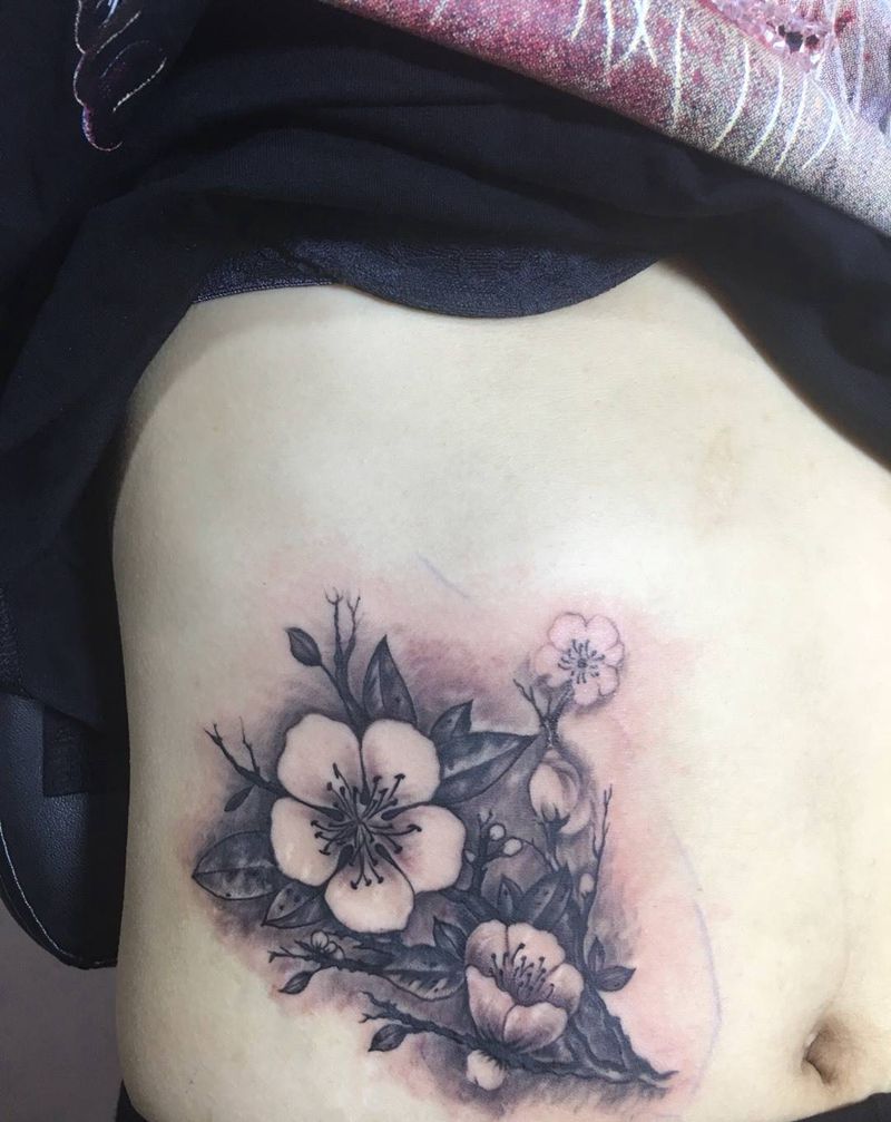 遮盖疤痕纹身图片_成品腹部传统植物纹身图案