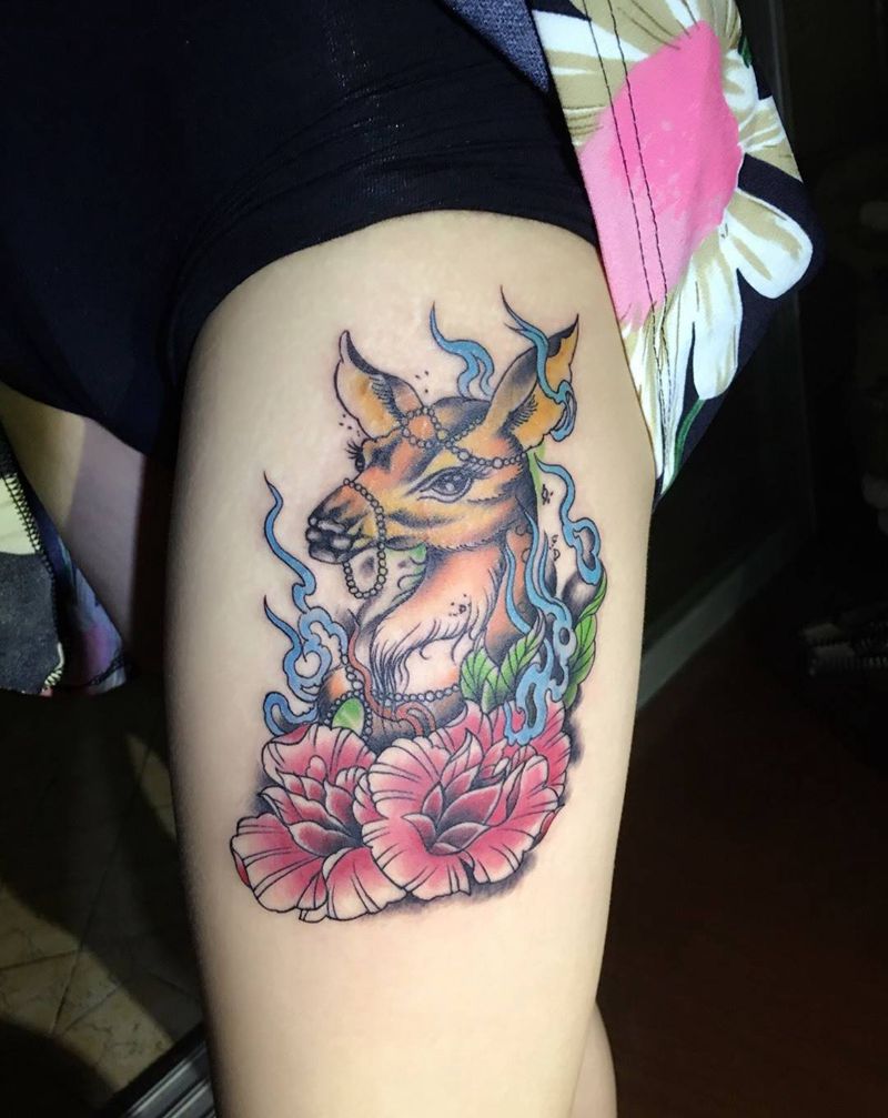当前位置: 首页 >广东省广州市纹身店-永恒刺艺艺术纹身纹身图案>麋鹿纹身图片_成品腿部清新动物纹身图案