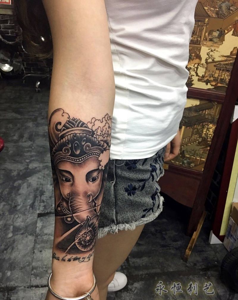 当前位置: 首页 >广东省广州市纹身店-永恒刺艺艺术纹身纹身图案>象神纹身图片_成品手臂清新动物纹身图案
