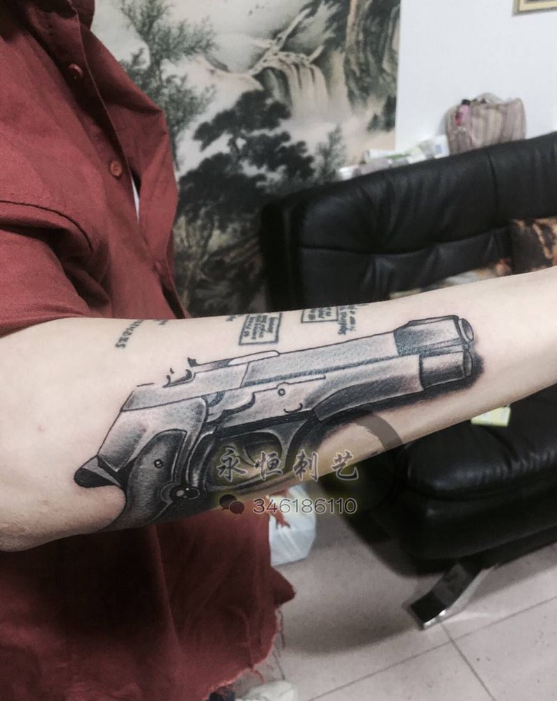当前位置: 首页 >广东省广州市纹身店-永恒刺艺艺术纹身纹身图案>枪手纹身图片_成品手臂清新纹身图案