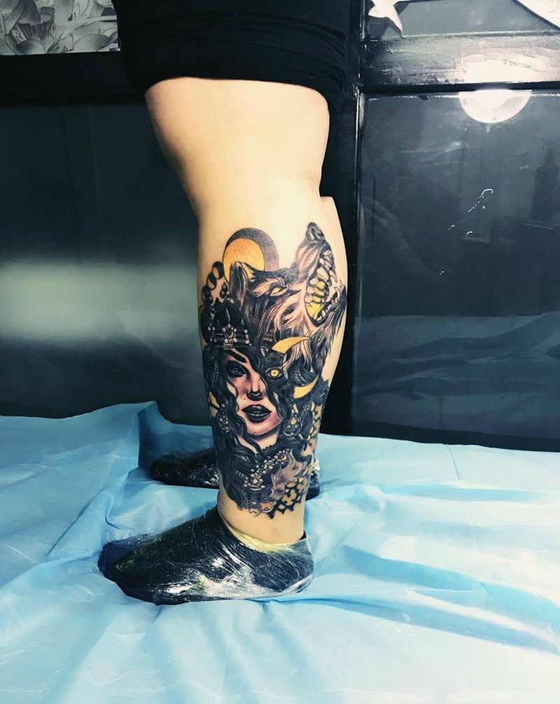 • T网红王老大花腿龙纹身图片_腿部新传统纹身图案