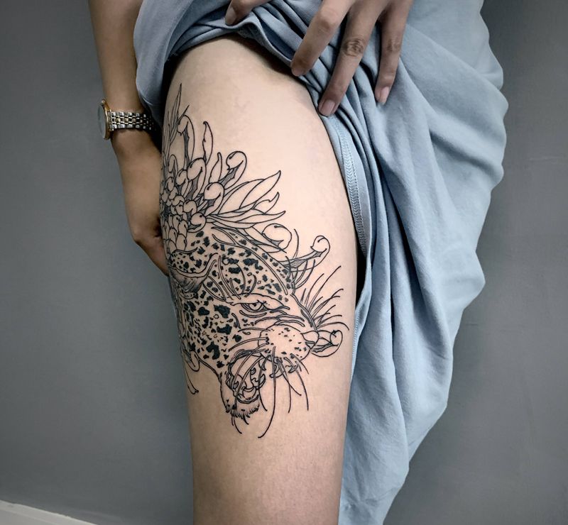 • T网红王老大花腿龙纹身图片_腿部新传统纹身图案