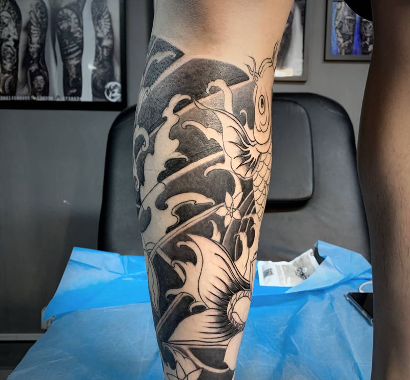 • T网红王老大花腿龙纹身图片_腿部新传统纹身图案