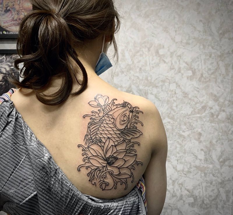 鲤鱼线条纹身图片_背部新传统老传统纹身图案