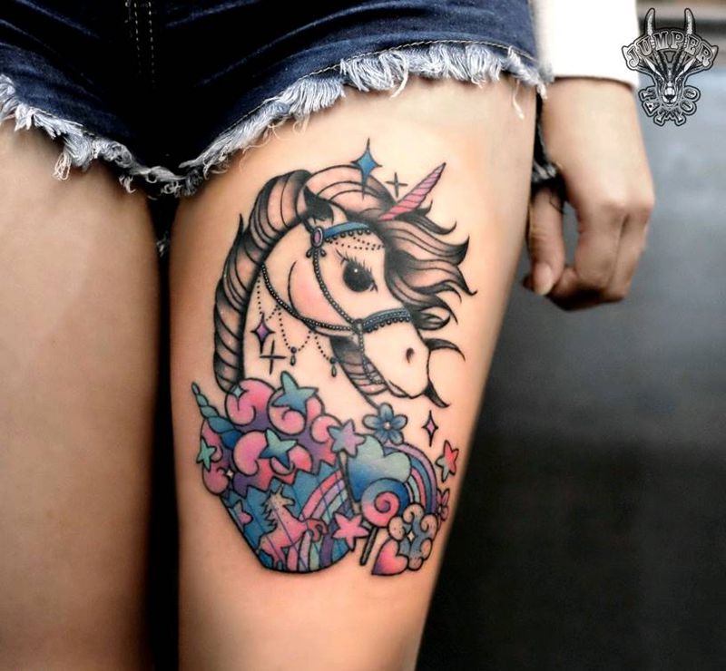 当前位置: 首页 >广东省广州市纹身店-IN TATTOO纹身图案>独角兽纹身图片_腿部欧美清新动物人物植物静物原创成品纹身图案