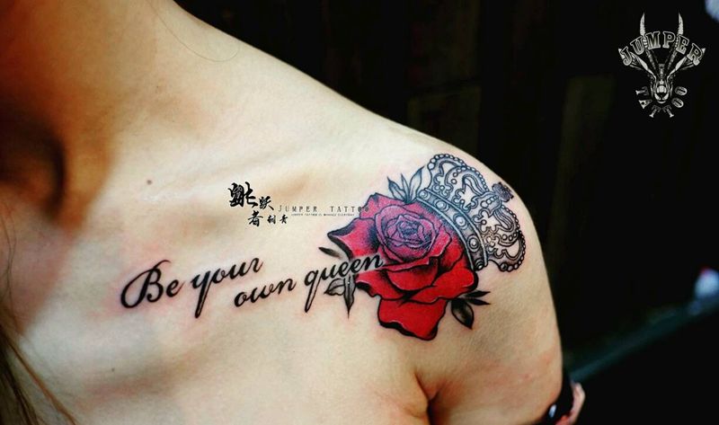 清新小英文玫瑰皇冠纹身图片_肩部欧美清新字符植物静物原创成品手稿插画纹身图案