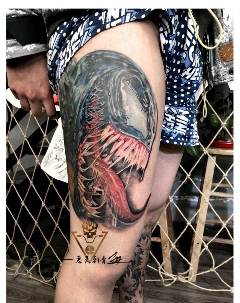毒液纹身图片_腿部欧美写实毒液写实欧美纹身图案