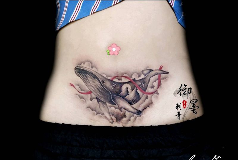 疤痕遮盖纹身图片_腹部欧美写实鲸鱼纹身图案