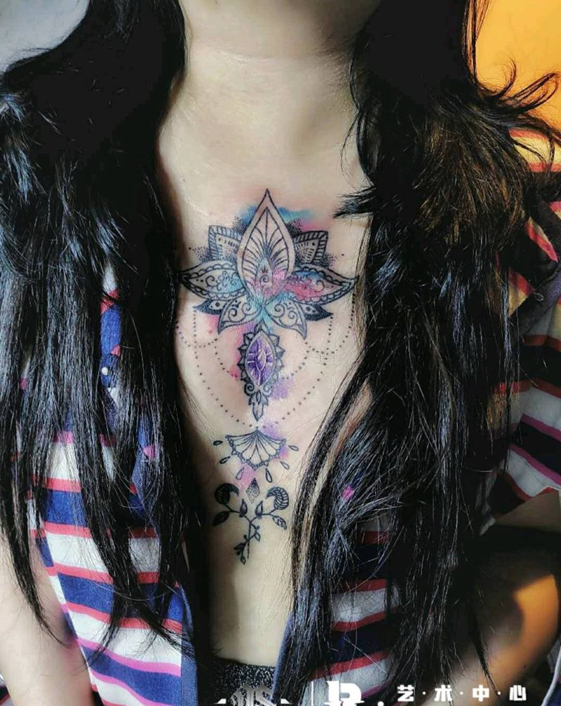 疤痕遮盖,纹身图片_胸部水彩几何水彩遮盖繁花纹身图案