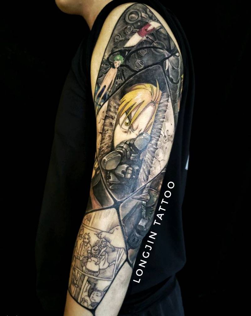 当前位置: 首页 >广东省广州市纹身店-贰柒刺青纹身图案>《钢之炼金术师》花臂未完成纹身图片_手臂欧美写实原创动漫纹身图案