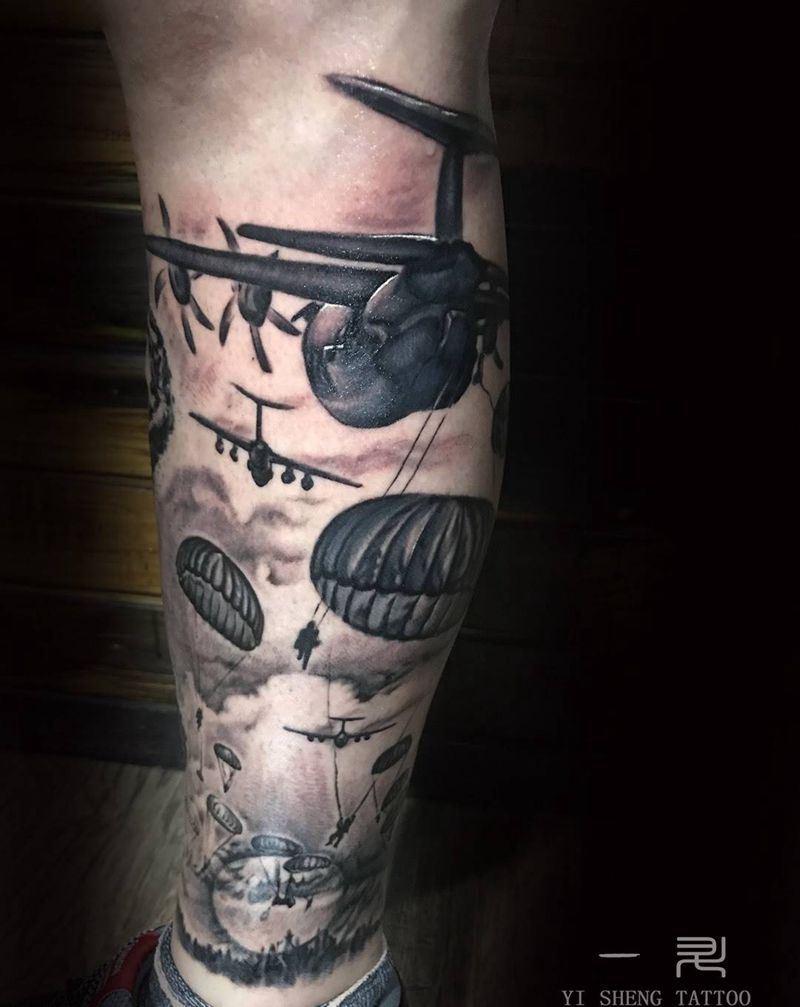 战争花腿纹身图片_腿部欧美写实纹身图案