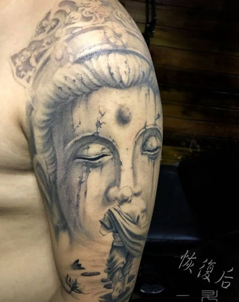 石雕佛像纹身图片_手臂欧美写实纹身图案