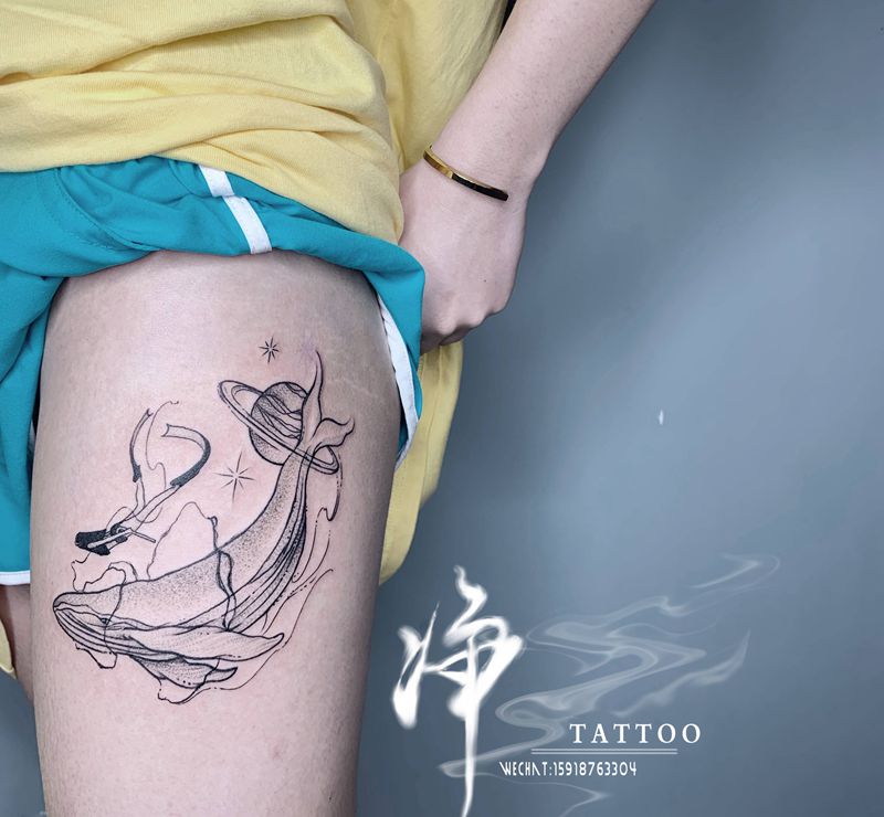 当前位置: 首页 >广东省广州市纹身店-净刺青纹身图案>鲸鱼+潜水员纹身图片_腿部点刺水墨鲸鱼潜水员纹身图案
