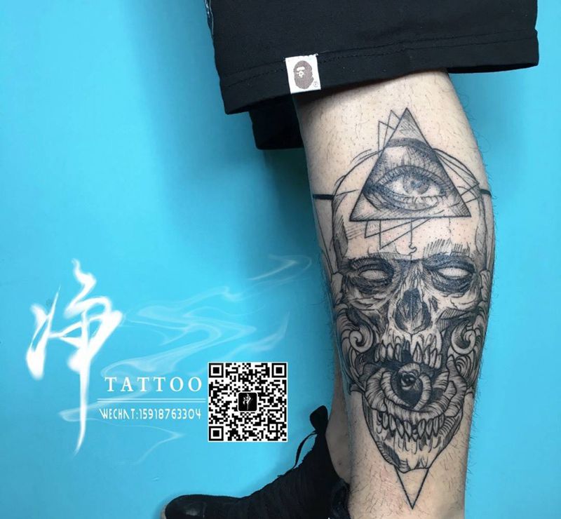 骷髅几何纹身图片_成品腿部欧美写实传统习俗肖像几何人物鬼神纹身图案
