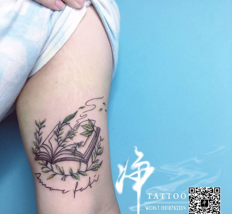 书本纹身图片_成品手臂欧美清新传统写实贴纸植物字符原创纹身图案