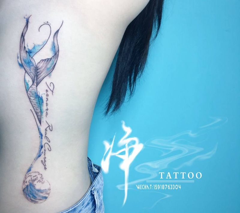 人鱼的尾巴纹身图片_成品水彩花体字鬼神原创美人鱼清新腹部纹身图案