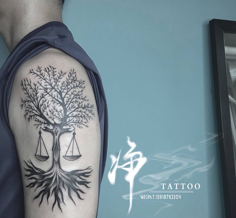 天平座加一颗大树纹身图片_手臂几何欧美写实树天秤座纹身图案