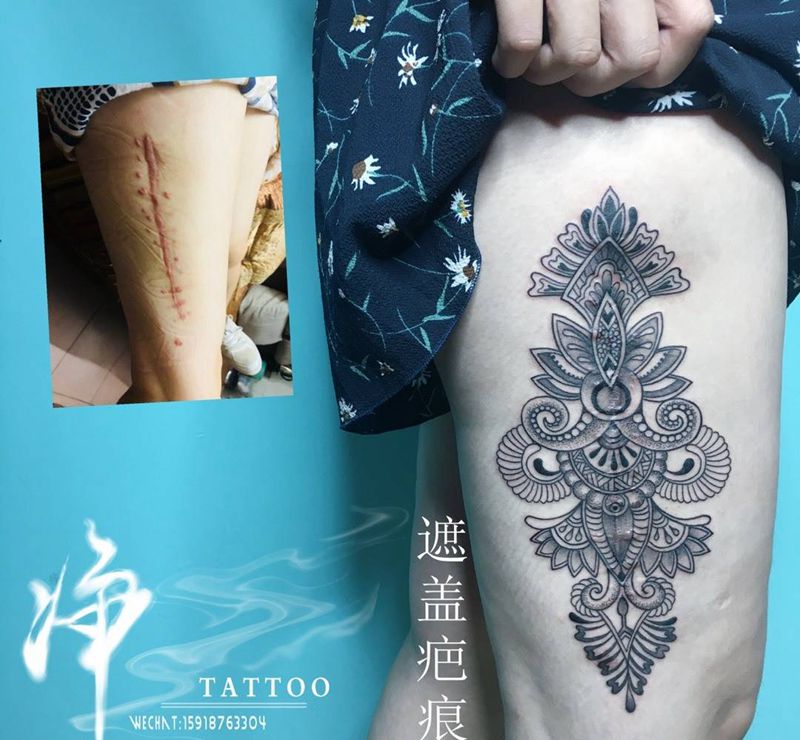 遮盖疤痕纹身图片_臀部腿部点刺图腾梵花遮盖疤痕纹身图案
