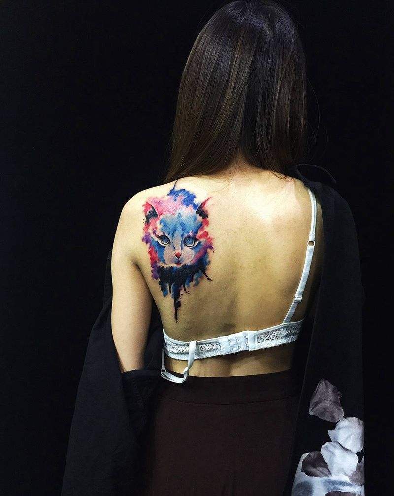 水墨猫纹身图片_肩部背部水彩水墨纹身图案