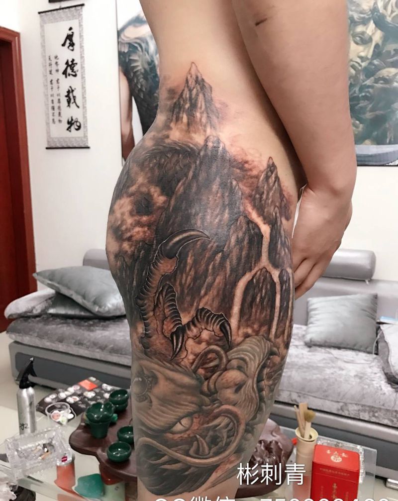 • T网红王老大花腿龙纹身图片_腿部新传统纹身图案