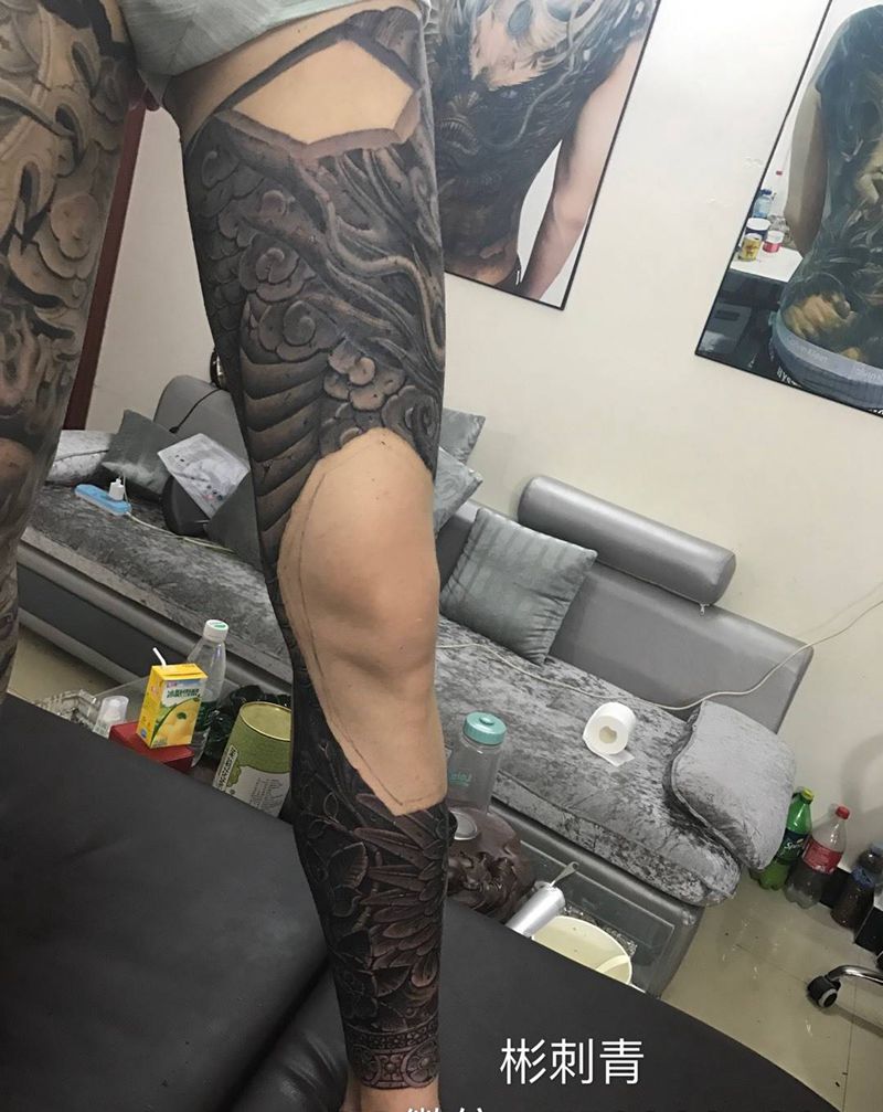 • T网红王老大花腿龙纹身图片_腿部新传统纹身图案