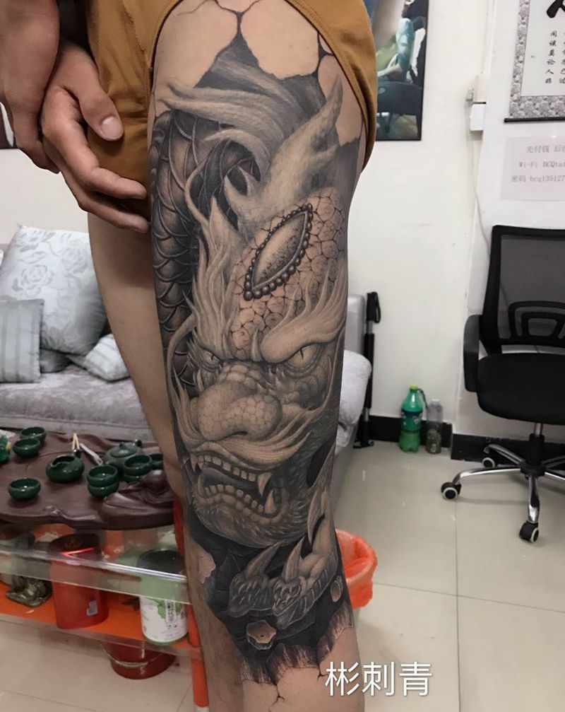 • T网红王老大花腿龙纹身图片_腿部新传统纹身图案