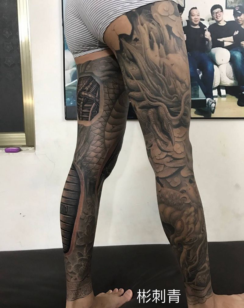 • T网红王老大花腿龙纹身图片_腿部新传统纹身图案