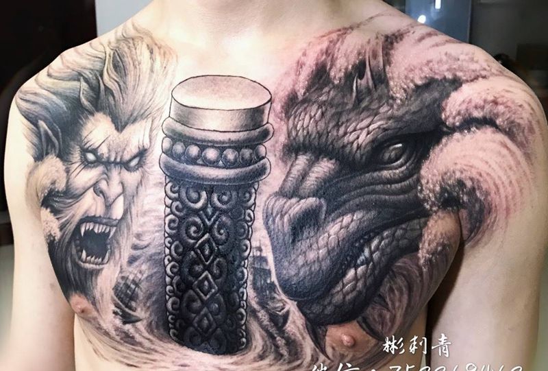 定海神针纹身图片_胸部新传统欧美写实纹身图案