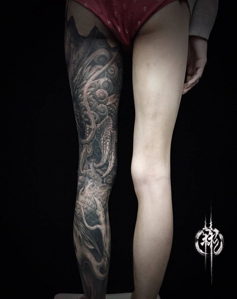 • T网红王老大花腿龙纹身图片_腿部新传统纹身图案