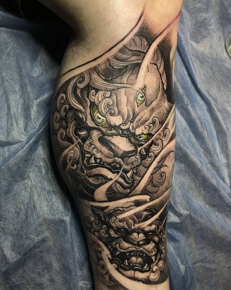 当前位置: 首页 >广东省广州市纹身店-广州怪咖纹身刺青纹身图案>|双生唐狮|纹身图片_腿部新传统唐狮新传统纹身图案