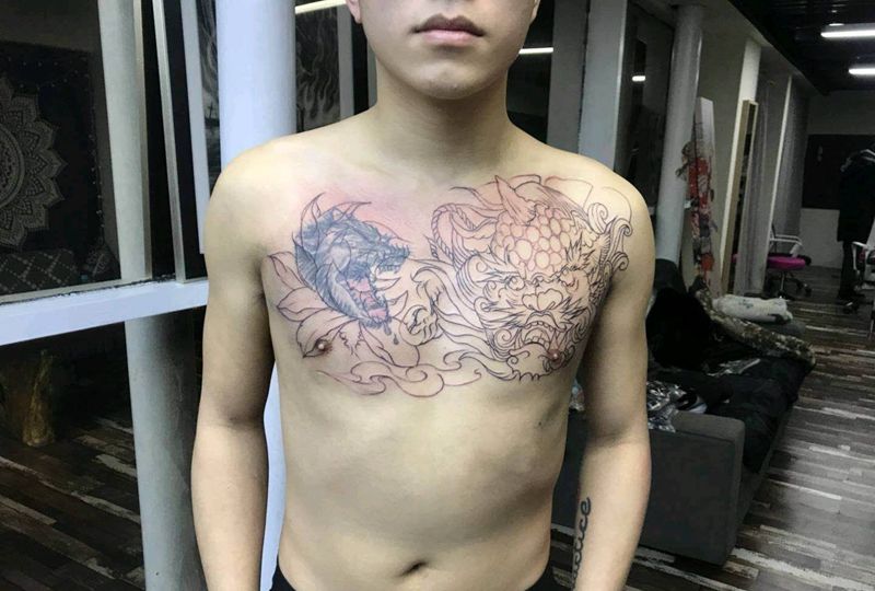 当前位置: 首页 >广东省广州市纹身店-TNT tattoo纹身图案>唐狮花胸,荷花遮盖滴血狼头纹身图片