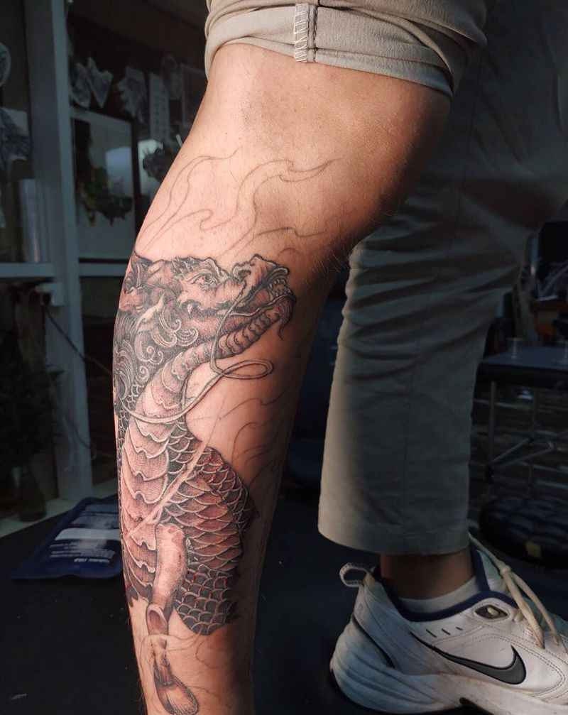 • T网红王老大花腿龙纹身图片_腿部新传统纹身图案