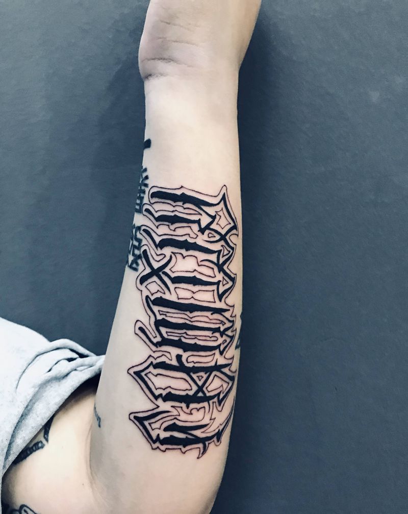 当前位置: 首页 >广东省广州市纹身店-墨刺青纹身图案>花体字纹身图片_手臂手部花体字纹身图案