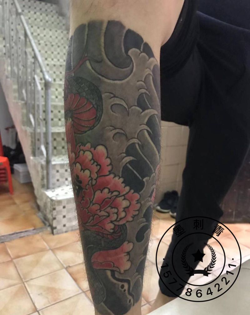 包小腿 恢复后纹身图片_腿部脚部老传统蛇 牡丹纹身图案