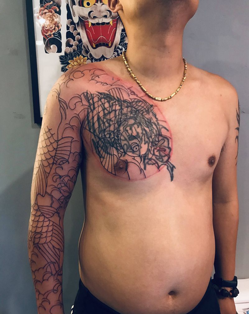 日式遮盖纹身图片_胸部手臂老传统纹身图案